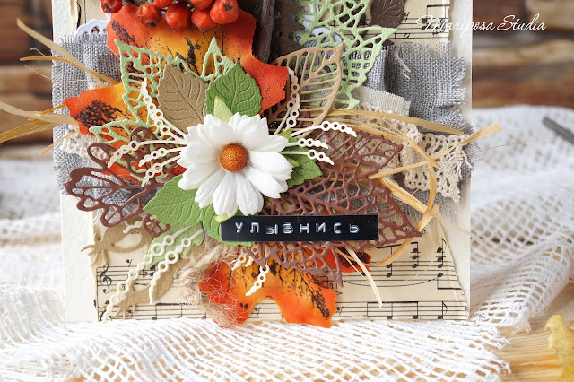 Добавила пару отрезов льна, кружево, много вырубки различных листиков, ромашку и высохшую веточку.